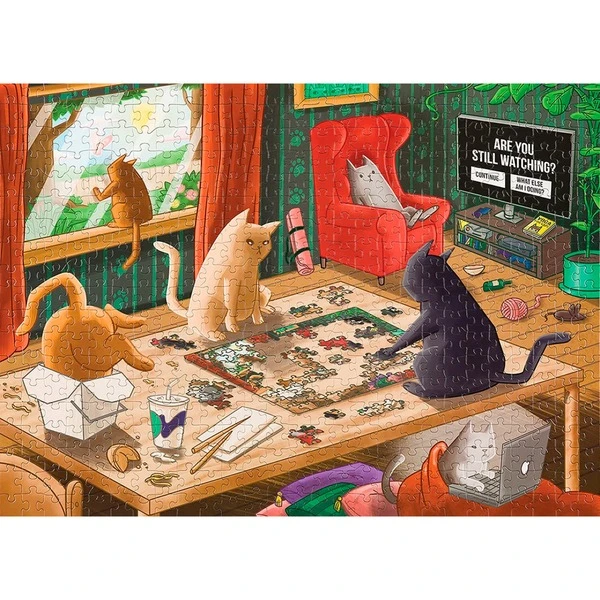 Die Puzzles aus der Welt der Exploding Kittens bieten herrlich verrückte Motive und großen Puzzlespaß. Die Motive sind katzenhafte Interpretationen besonderer Werke der Kunstgeschichte oder Charaktere aus dem Universum von Exploding Kittens. Die Puzzleteile bestehen zu 100% aus recyceltem Material. Das Puzzle Cats in Quarantine zeigt Katzen beim Zeitvertreib in der Quarantäne.Art.-Nr.: 1901682