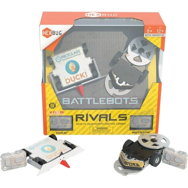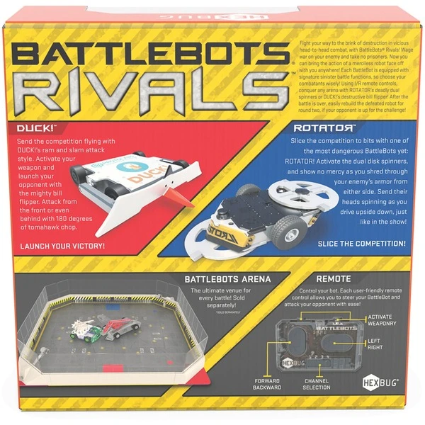 Dieses Duo ist der Schrecken in jeder Arena: Wenn Rotator mit hoher Geschwindigkeit und seinen gefährlich rotierenden Scheiben oder DUCK! mit seinem riesigen Hebearm angreifen, muss die Konkurrenz richtig gut gerüstet sein. Als Nachbildungen der beliebten BattleBots aus der Fernsehserie wurden Rotator und DUCK! originelgetrau gestaltet.Art.-Nr.: 100008410