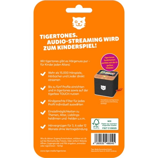Das Ticket ist die Eintrittskarte in unsere tigertones-Audiothek, eine Streaming-Plattform von Kinderhörspielen, Hörbüchern und Kinderliedern und das mit einer Auswahl aus über 15.000 Titeln. Mit dabei sind die beliebtesten Kinderhelden wie Das Dschungelbuch, Olaf taut auf, Teufelskicker, Die wilden Kerle, Barbie, Paw Patrol, Mia and me, Prinzessin Lillifee, Biene Maja und noch viel mehr. Das Beste daran: In der tigertones gibt es nicht nur eine Folge des Lieblingshelden, sondern es gibt sie alle, unbegrenzt und jederzeit verfügbar. Mit dem Ticket wird ein Premium-Zugang über einen Zeitraum von wahlweise 3, 6 oder 12 Monaten erworben, welcher nach Ablauf automatisch endet. Mit unserem Prepaid-System gewährleisten wir, dass die volle Kostenkontrolle bei den Eltern liegt. Die Audiothek ist am besten erlebbar mit der dazu passenden Hörbox – der tigerbox Touch.